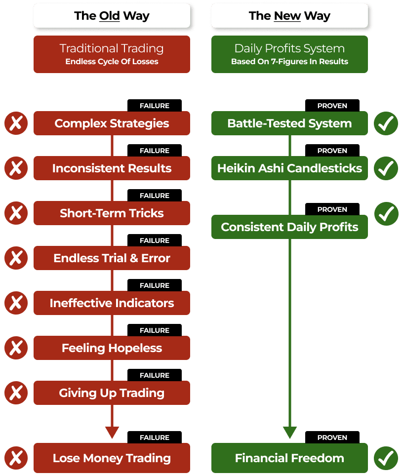 No. The beauty of the Daily Profits System is that it thrives in ANY market condition. While most trading systems fall apart when volatility hits, ours actually takes advantage of it. The secret is the unique way we use Heiken Ashi candlesticks to spot trend reversals before they happen. This lets us stay ahead of the market.